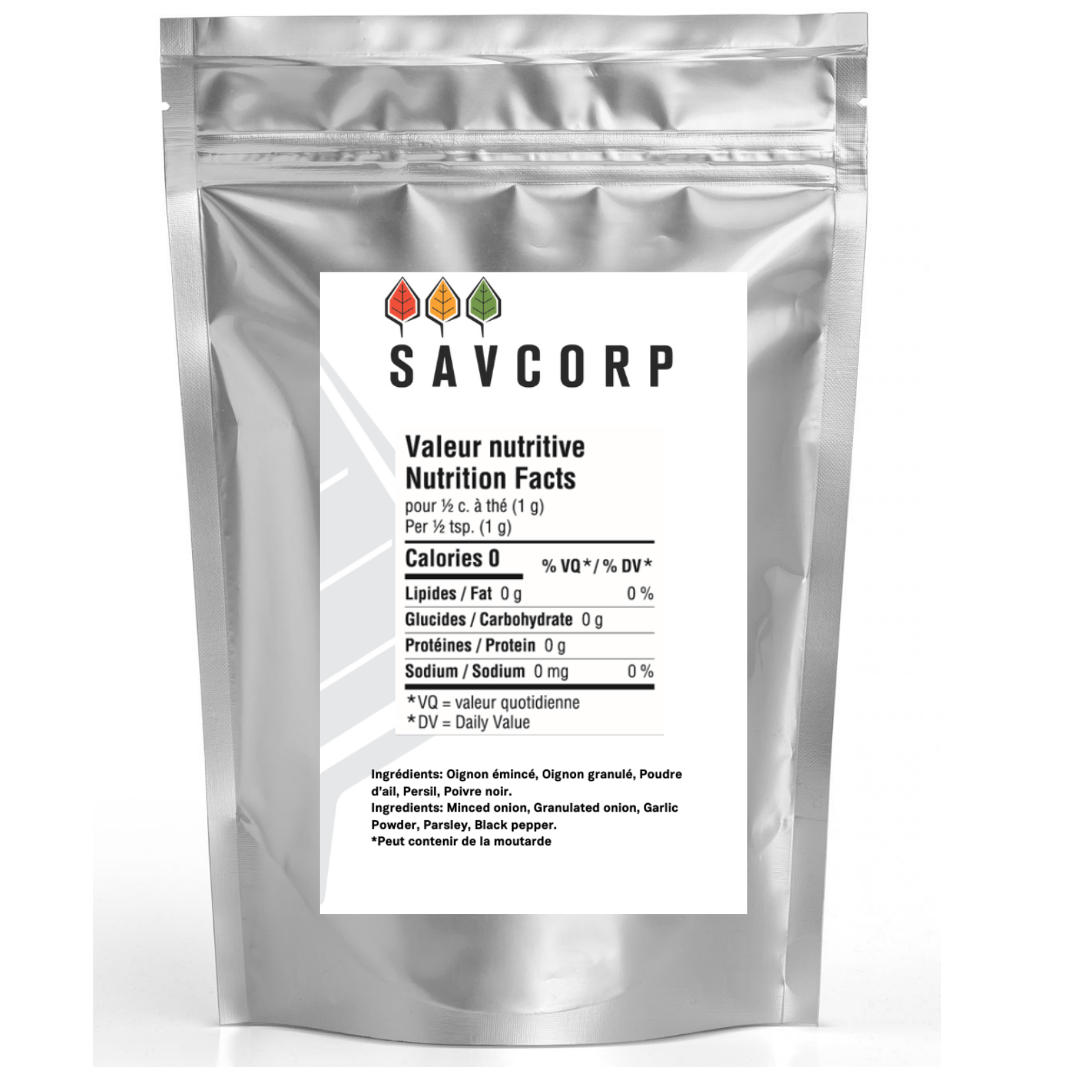 Oignon émincé, oignon granulé, poudre d’ail, persil, poivre noir. Sans sucre, sans irradiation, sans OGM, compatible avec l’alimentation cétogène (keto) et végan.